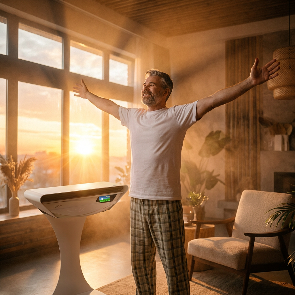El descanso es un factor clave de tu entrenamiento deportivo. En esta fase tu cuerpo recupera energía y produce el crecimiento muscular. Biow trabaja 24/7 para crear una cámara antioxidante en tu habitación, que hace que tus células se regeneren más y mejor.